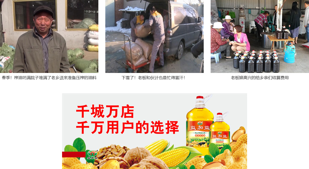 開榨油坊不必再背井離鄉(xiāng)去外地打工,只需購買益加益榨煉一體化榨油機(jī)設(shè)備,農(nóng)忙時(shí)候干農(nóng)活,農(nóng)閑時(shí)候榨油賺錢,兩頭兼顧,還可以和家人享受天倫之樂。通過來料加工,接收周邊農(nóng)戶送來的油料即可實(shí)現(xiàn)邊壓榨邊煉油,煉出的油品濃香鮮純,原汁原味,下鍋不起沫,油坊按照壓榨油料的重量或出油量收取加工費(fèi),或者為農(nóng)戶免費(fèi)榨油,出售壓榨后的油餅作為收入,這些都是致富的好門路,既幫鄉(xiāng)親們吃上好油,自己也賺了加工費(fèi)。